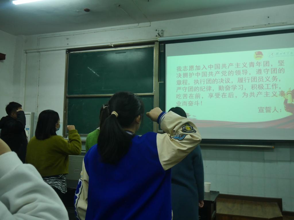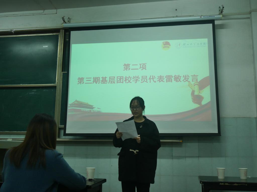 开班仪式第一项,全体成员起立一同奏唱中国共产主义青年团团歌《光荣啊,中国共青团》。接下来,第三期基层团校学员代表雷敏同学发言,倡导每位青年都将“系党团、驭时事、绽青春”的信念牢记心中,并融会贯通、身体力行。法公司党委副书记张梦婵书记讲话,张书记给同学们提出了学习要求,指出了努力方向,希望青年们在“学理论”上下工夫,在“强信念”上下工夫,在“跟党走”上下工夫,每一位团校成员在课程期间勤于学习,勇于实践,善于创造,不负重托,充分发挥青年的先进带头作用,在以后的学习工作中都能不忘入团初心,牢记青春使命,在实现中华民族伟大复兴中国梦的新征程上奋勇前进。而后团校学员们以高昂的情绪和澎湃的热情,在学员代表蔡玉曦同学领誓下重温入团誓词。