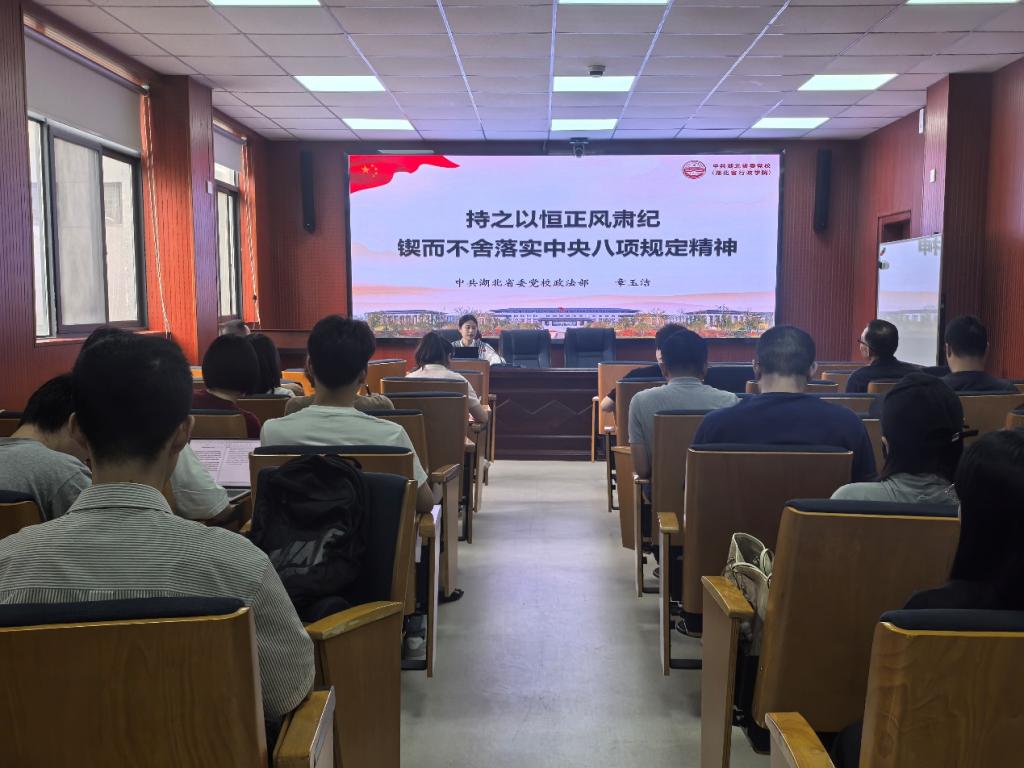 (通讯员:郭童)为深入贯彻中央八项规定精神学习教育,持续推进作风建设,4月28日下午,beats365在模拟法庭举办深入贯彻中央八项规定精神学习教育,特邀湖北省委党校章玉洁老师作题为《持之以恒正风肃纪 锲而不舍落实中央八项规定精神》的专题讲座。beats365全体教职工、员工党支部书记参加了学习,活动由beats365教师党支部书记蔡大顺主持。